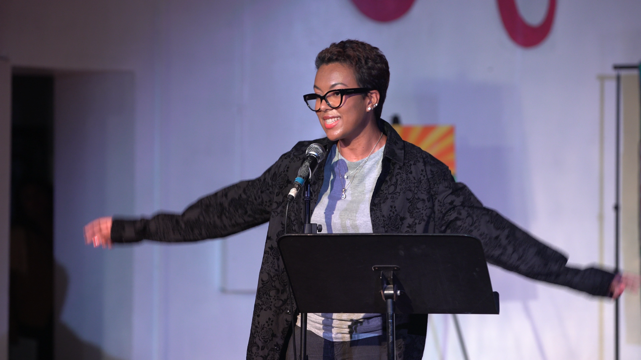 Poet and Spoken Word Artist Alba Delia Hernandez being introduced to perform a poem during "Indomitable" one of the events in the "Decolonizing the Conscience" series.