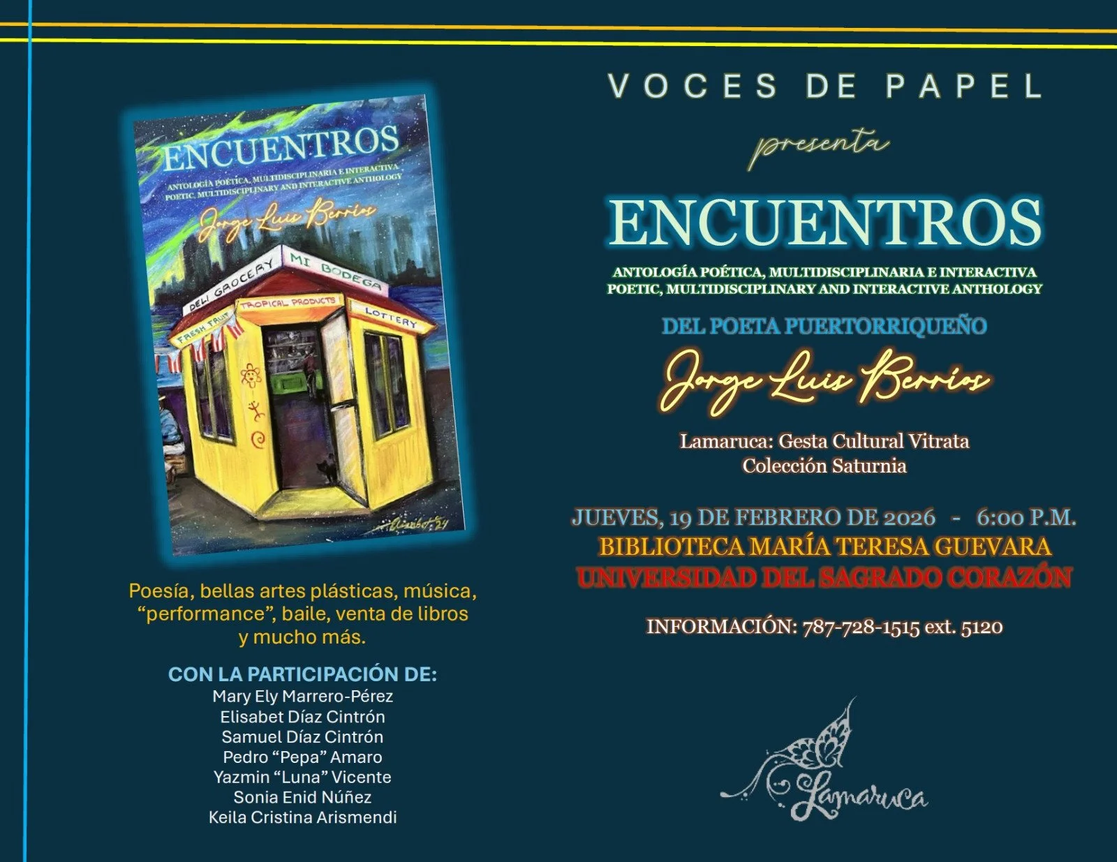 Throughout the evening, guests are invited to explore the artwork and meet the artists. The program also features an artist talk with Elisabet Díaz Cintrón and Sylvia Hernández, as well as poetry-based performances with Mario Cancel Bigay, Efrén Olson-Sánchez, and Jorge Luis Berríos.